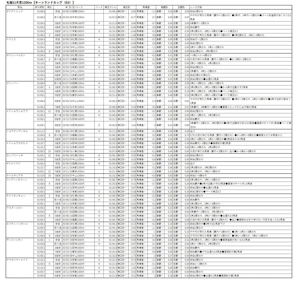 投稿日: 2020年8月28日 投稿者: 吉川8月30日WIN5対象レース持ちタイム比較 【持ち時計比較】※不利、馬場差などを考慮した持ちタイムです。※客観:物理的なロスである程度の計測が可能なもの。※主観:不利がありながら計測不可能なもので主観により補正したもの。※順位の( )は2018年以前のタイムです。※ペースのHはハイペース、Sはスローペース、Hハイペースのタイムは再現性が低い。 WIN①札幌10R WIN②新潟10R WIN③小倉11R WIN④札幌11R WIN⑤新潟11R