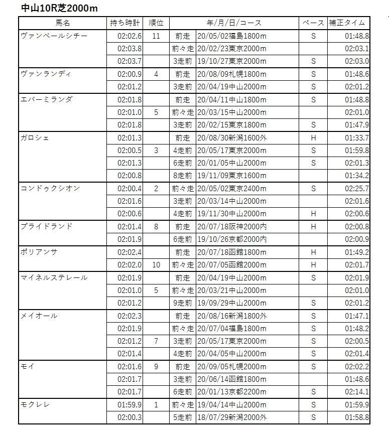 投稿日: 2020年9月18日2020年9月18日 投稿者: 吉川9月21日WIN5対象レース持ちタイム比較 【持ち時計比較】※不利、馬場差などを考慮した持ちタイムです。※客観:物理的なロスである程度の計測が可能なもの。※主観:不利がありながら計測不可能なもので主観により補正したもの。※順位の( )は2018年以前のタイムです。※ペースのHはハイペース、Sはスローペース、Hハイペースのタイムは再現性が低い。 WIN①中山9R WIN②中京10R WIN③中山10R WIN④中京11R WIN⑤中山11R