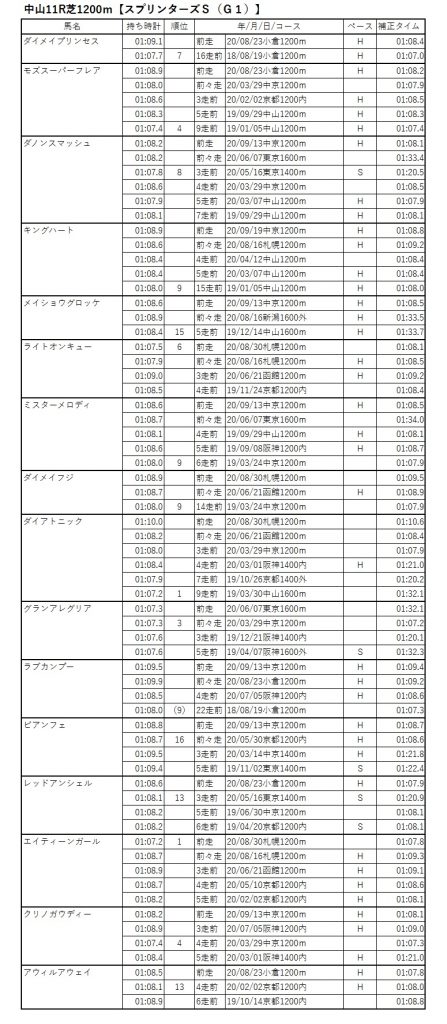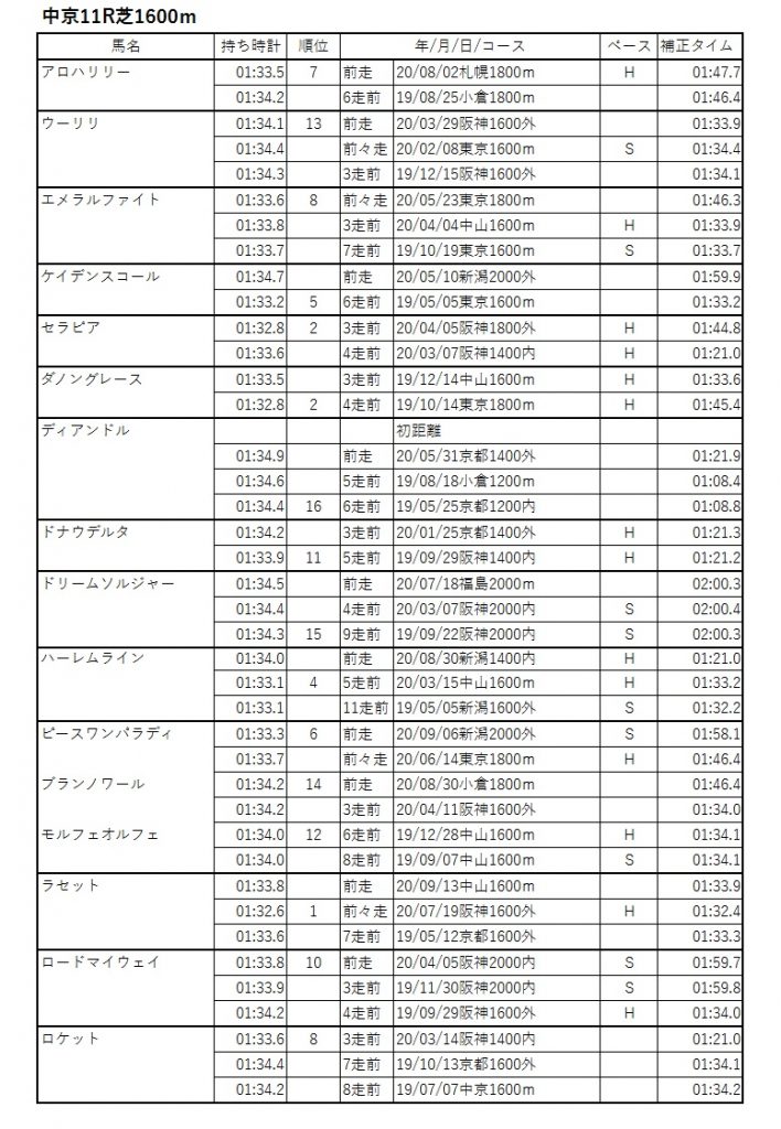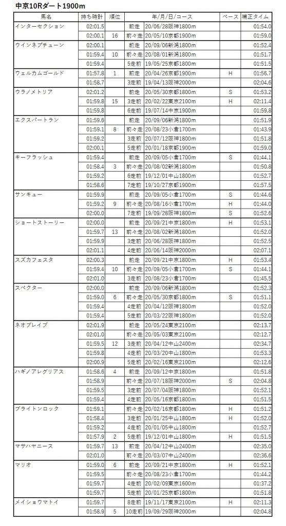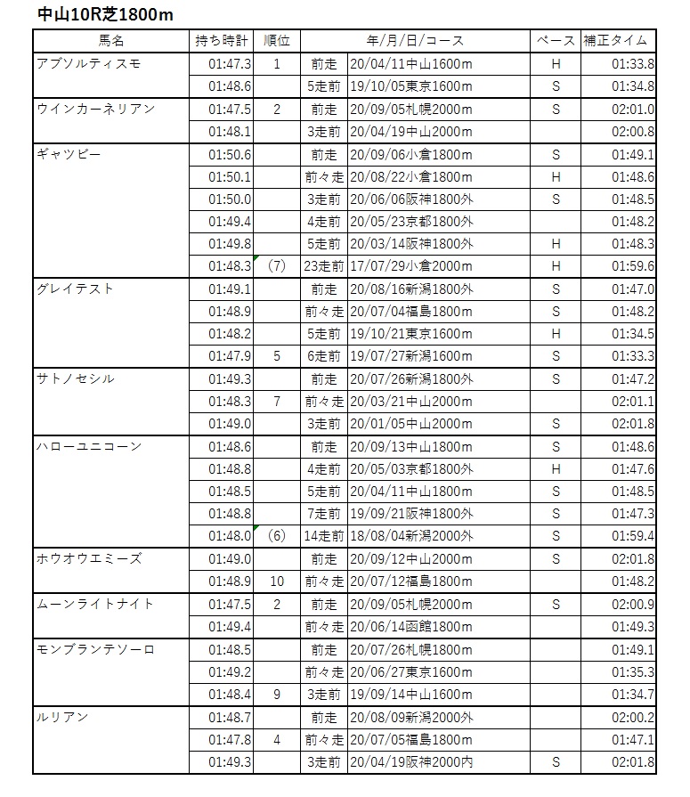 投稿日: 2020年10月2日2020年10月2日 投稿者: 吉川10月4日WIN5対象レース持ちタイム比較 【持ち時計比較】※不利、馬場差などを考慮した持ちタイムです。※客観:物理的なロスである程度の計測が可能なもの。※主観:不利がありながら計測不可能なもので主観により補正したもの。※順位の( )は2018年以前のタイムです。※ペースのHはハイペース、Sはスローペース、Hハイペースのタイムは再現性が低い。 WIN①中山9R WIN②中京10R WIN③中山10R WIN④中京11R WIN⑤中山11R